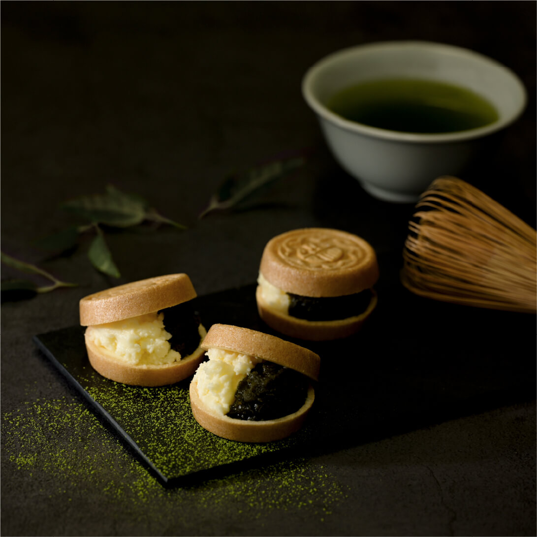 京都・宇治「丸久小山園」の抹茶を炊き合わせた特製餡とマスカルポーネチーズを使った自家製クリームを歯切れのよい最中皮に、お好みでサンドしていただく一品です。